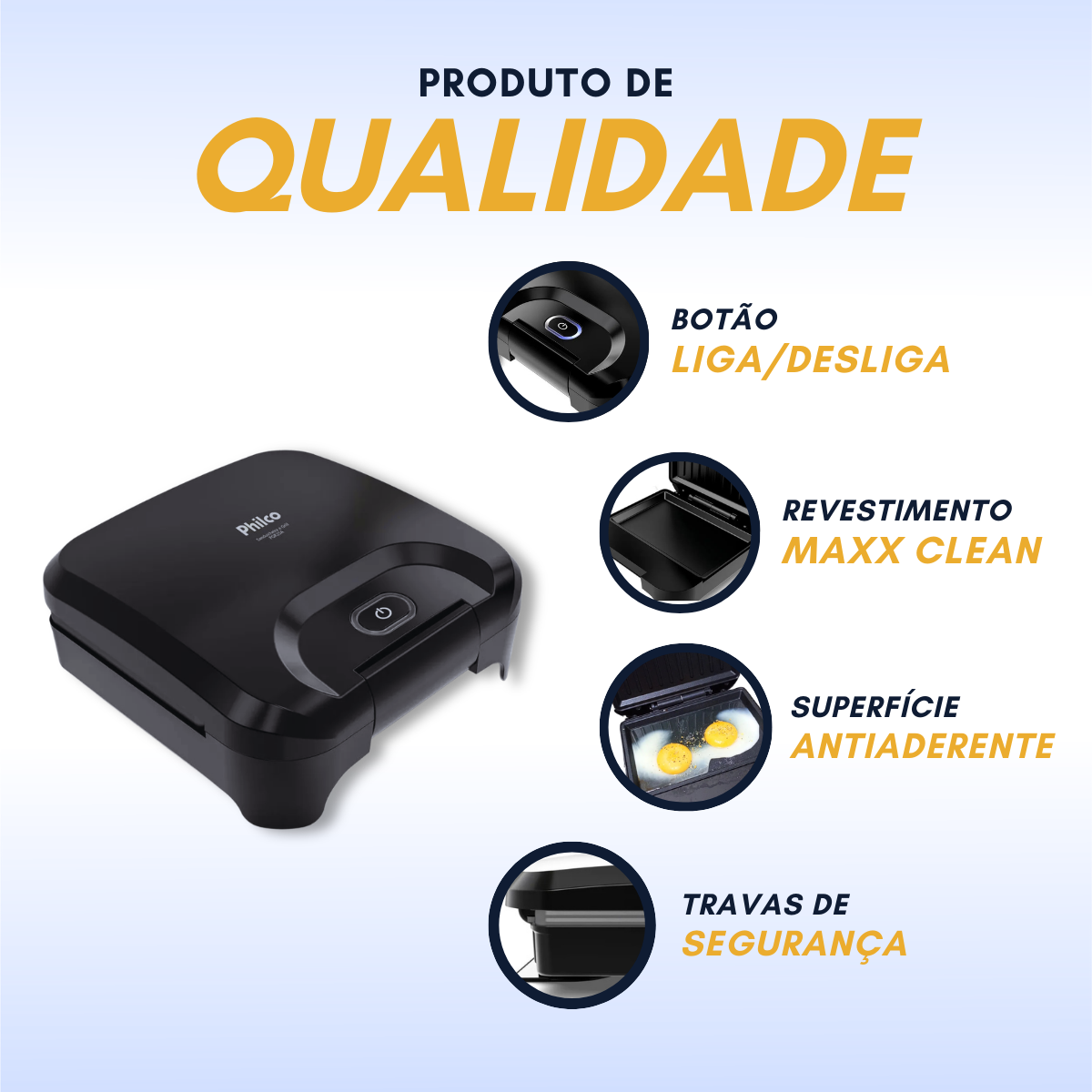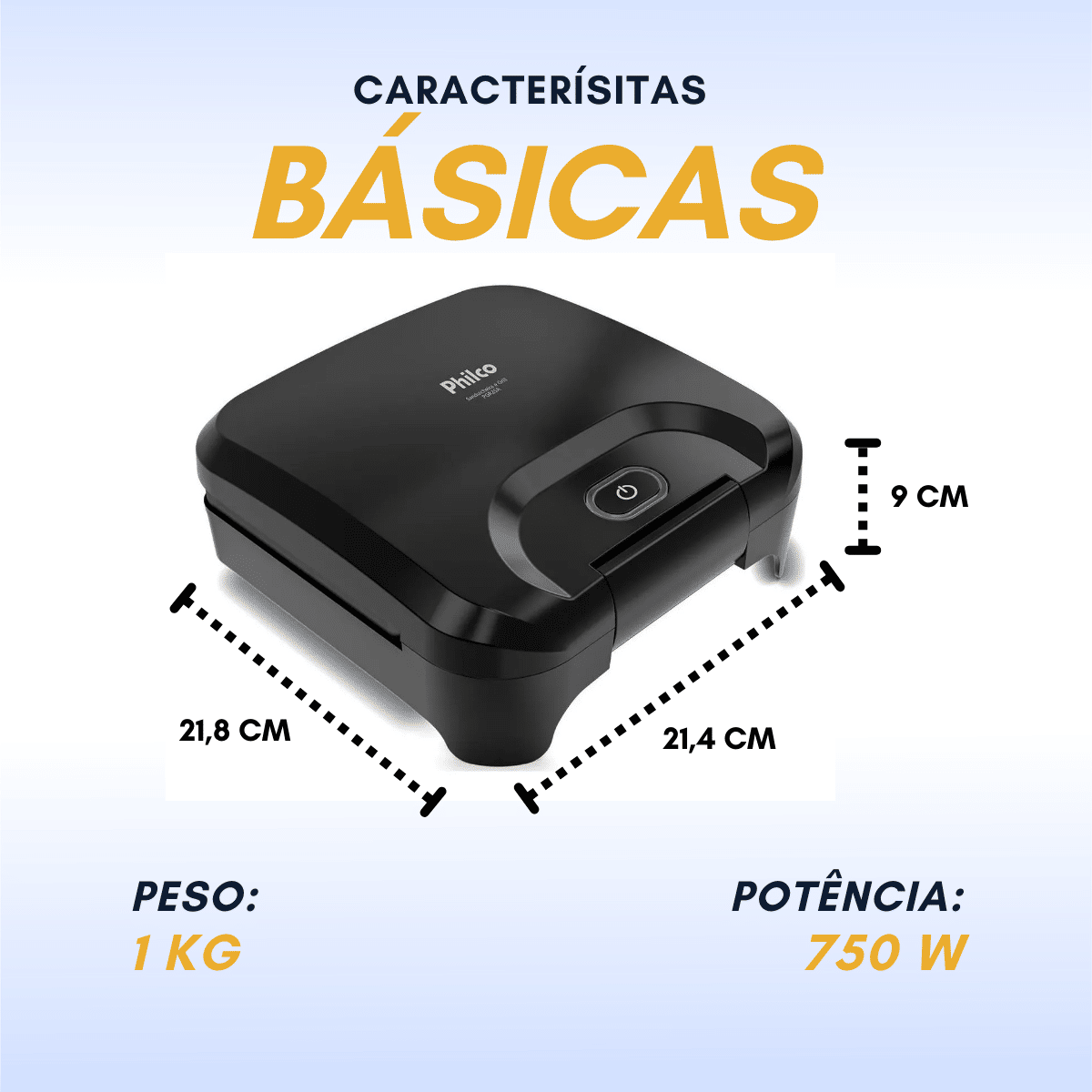 • Características: Aquecimento rápido, trava de fechamento, luz indicadora de funcionamento, base antiderrapante e fácil limpeza